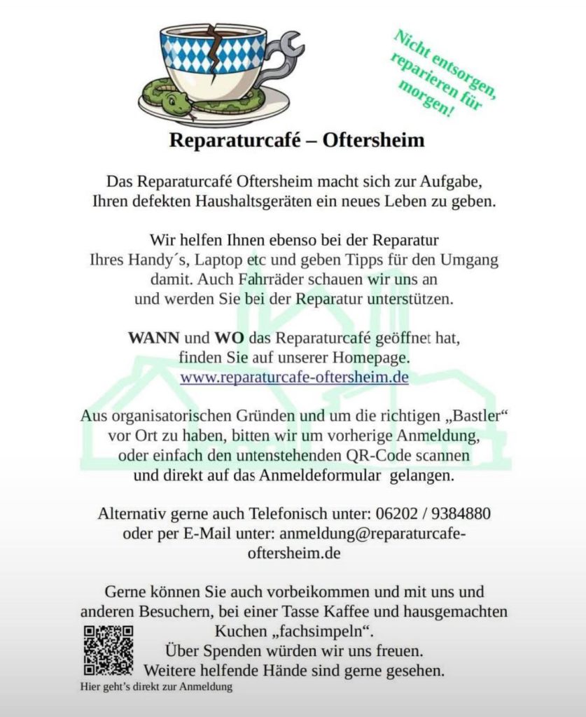 Bürgerschaftliches Engagement: Erste Infoveranstaltung Wir leben heute in einer Ex- und Hopp- Gesellschaft – Dinge und Geräte werden gekauft, gehen kaputt und können nicht mehr repariert werden.In vielen Dörfern und Städten haben sich schon Menschen zusammengefunden, die dagegen etwas tun Repair‑Café kommt nach Oftersheim weiterlesen