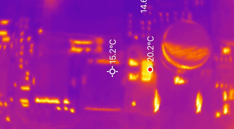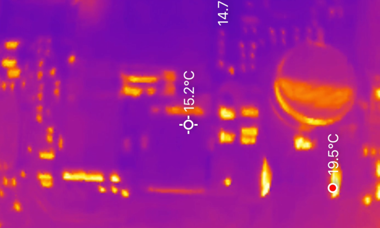 Hier sieht man einen Teil der Platine unter der Wärmebildkamera. Noch liegt keine Spannung am Kurzschluss an, von daher ist auch nichts erkennbar.